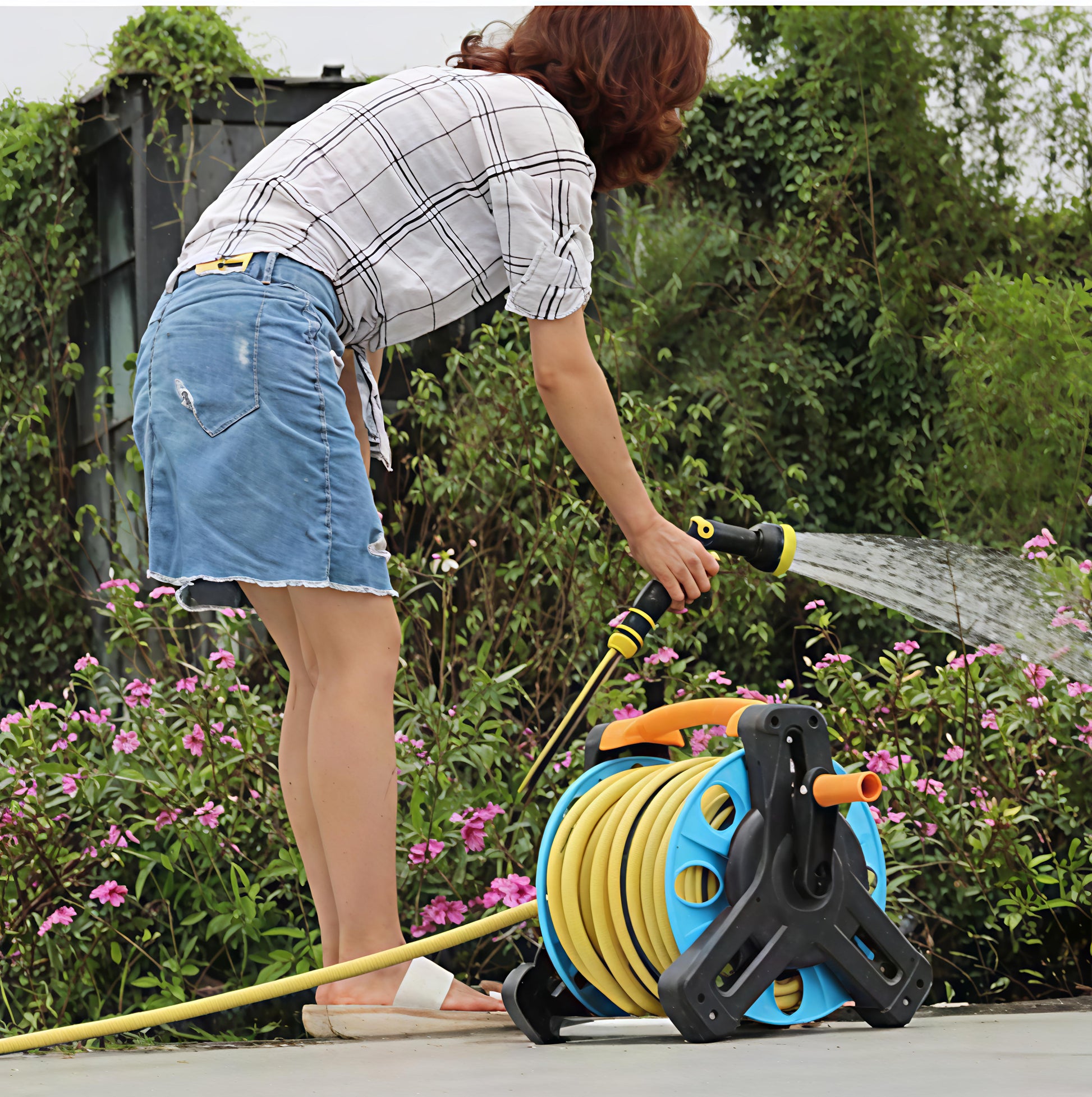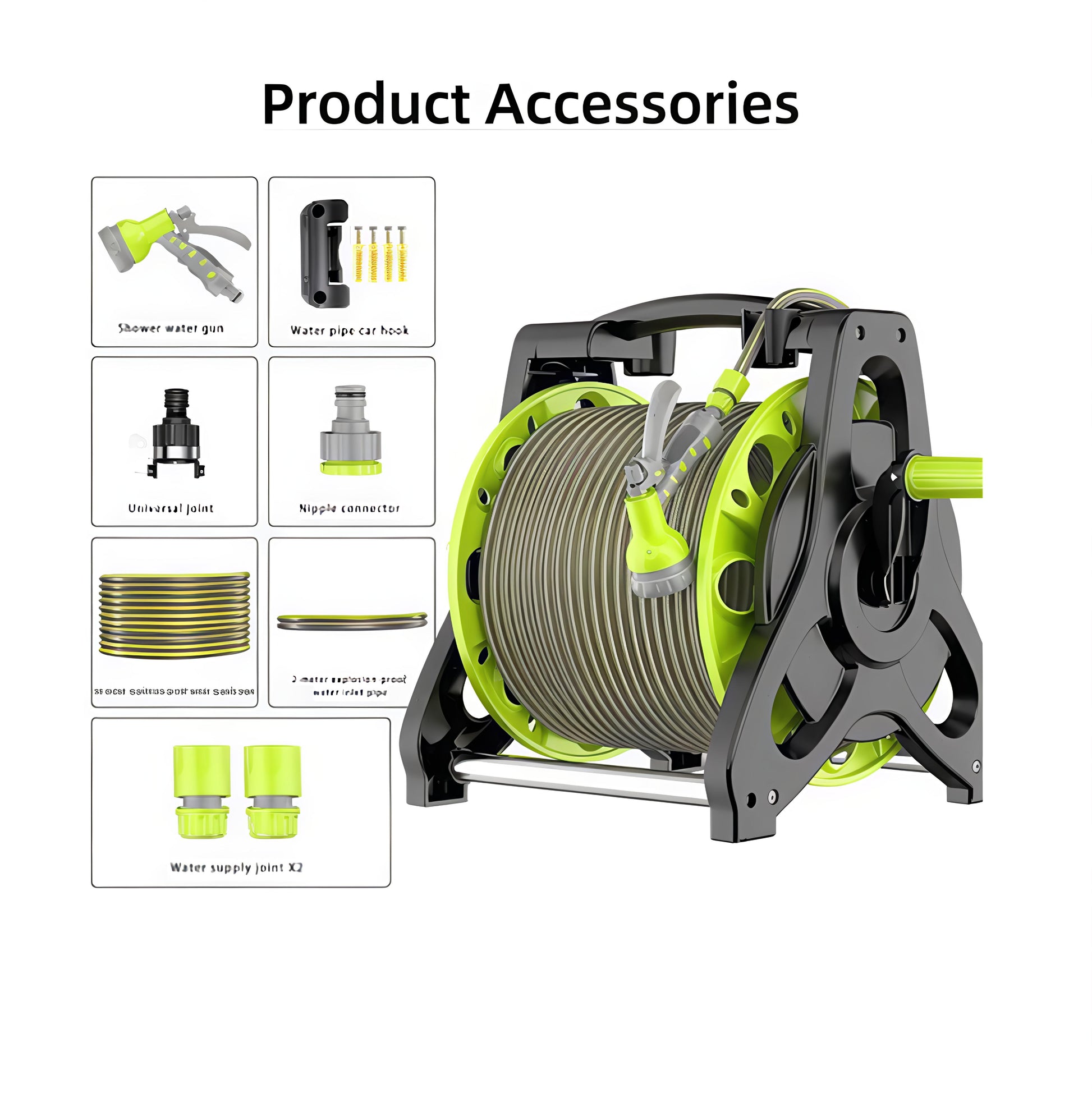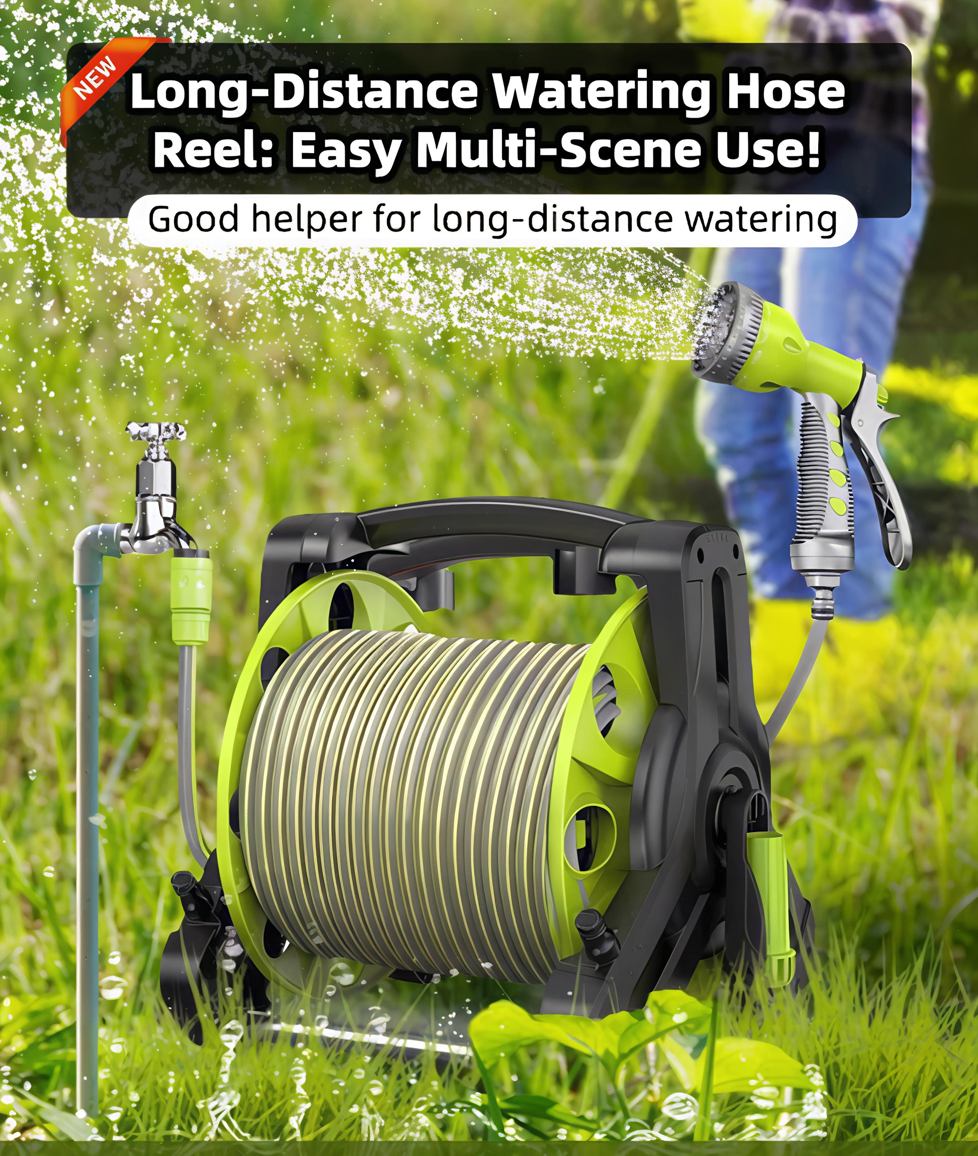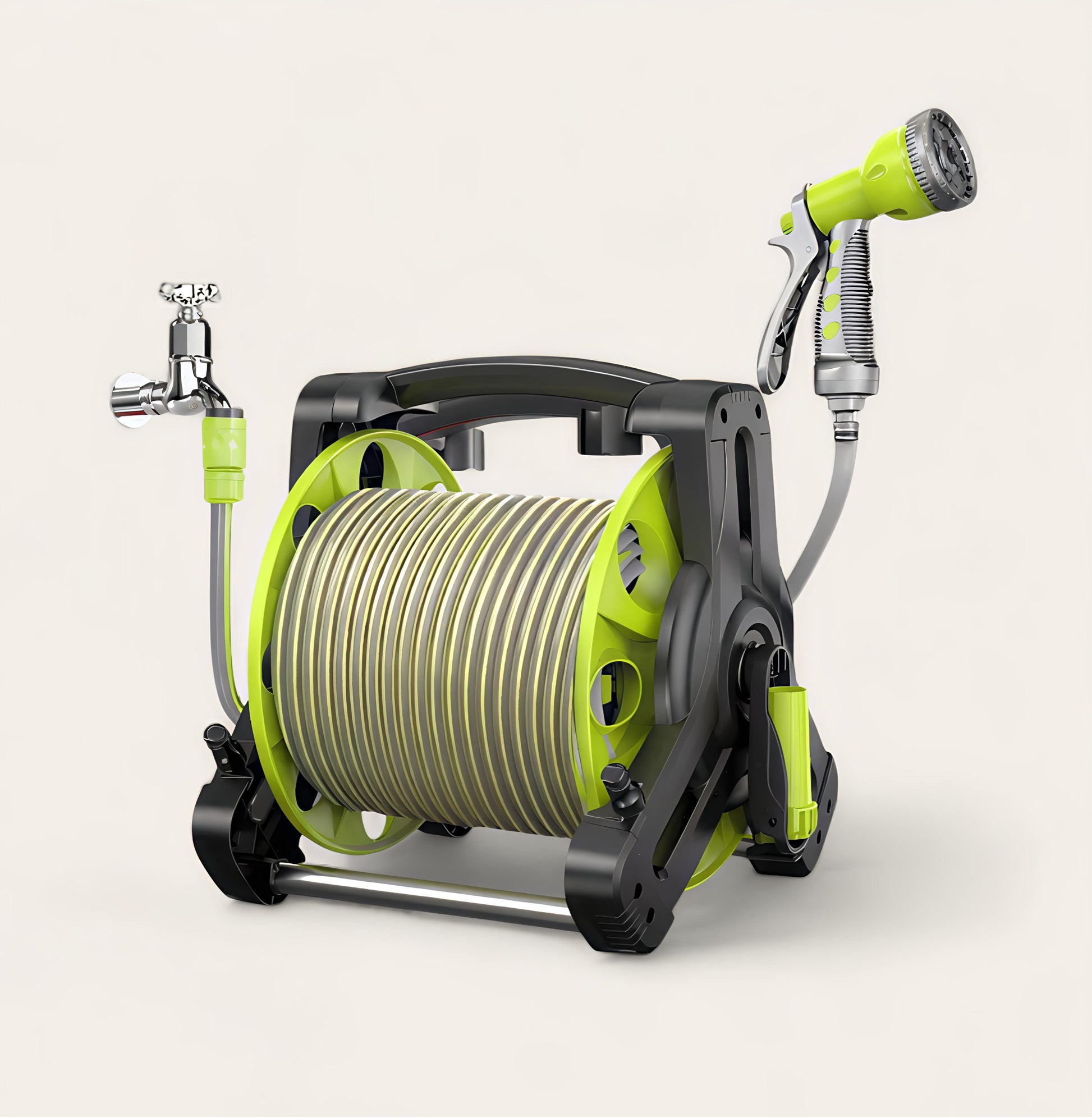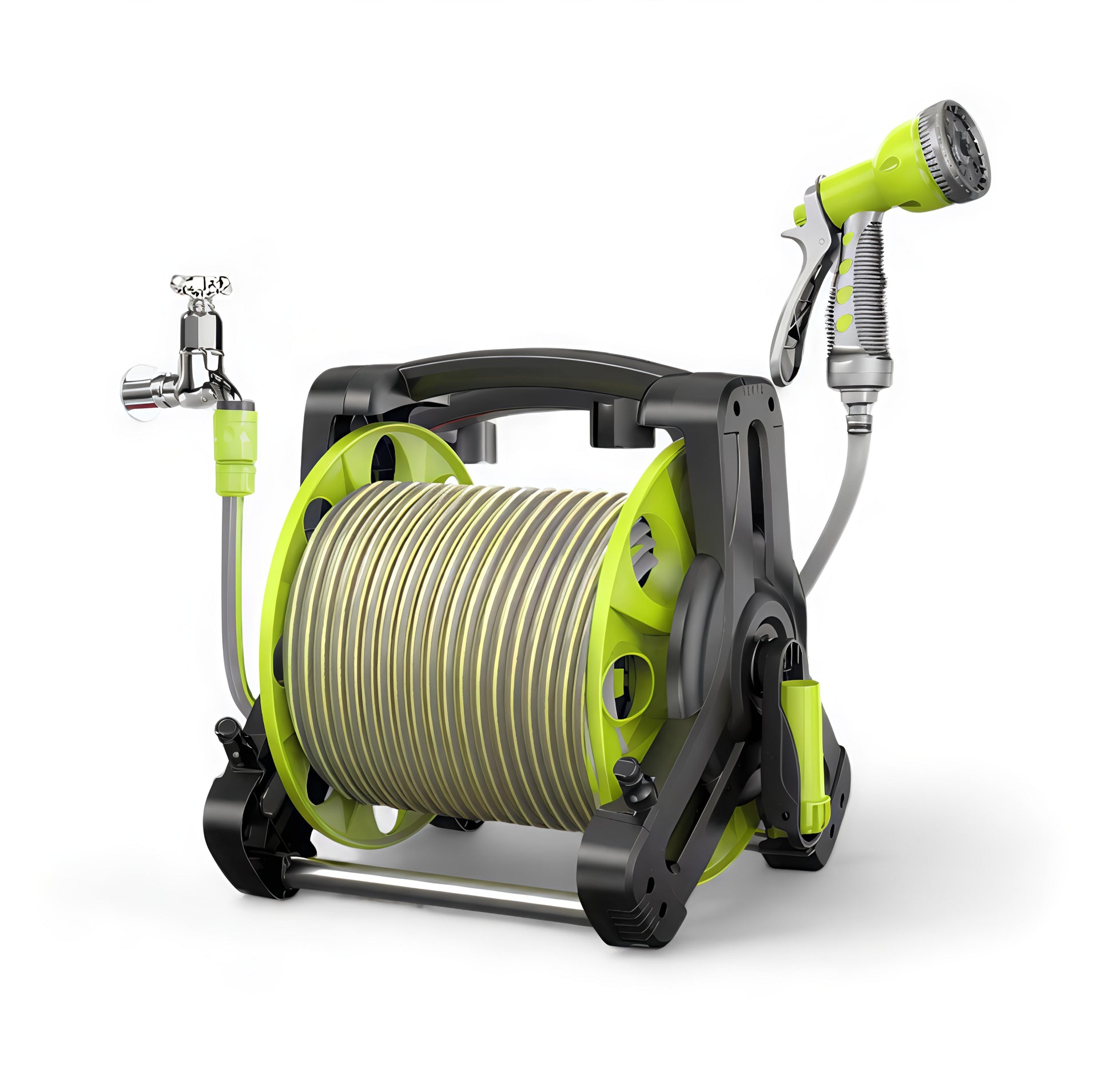 بكرةخرطوم مياه عملية مزودة برشاش متعدد الاستخدام لتلبية جميع احتياجات الري والتنظيف في الحديقة أو المنزل . تصميم مدمج وخفيف يجعل تخزين الخرطوم وسحبه سهل وسريع مع يد تدوير مريحة